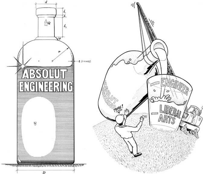 | Absolut Engineering, March 1992. I did this illo for an engineering t-shirt back at Tufts. I kinda have mixed feelings about this one, 'cause I've never been much of a drinker, but on the other hand, this is the first picture I ever made money on... |