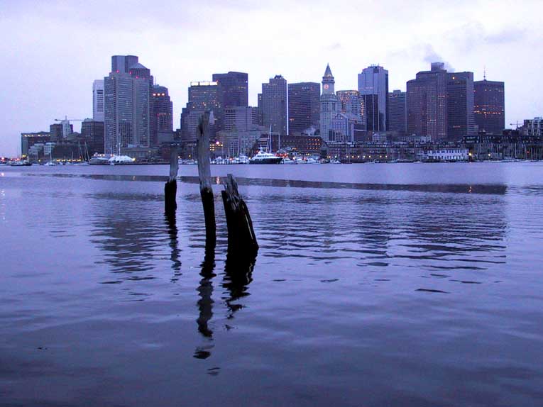 Downtown Boston, viewed at dawn from across the harbor, near the airport in East Boston. September 2, 2002