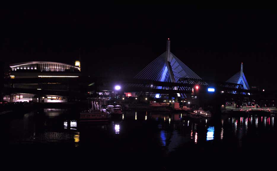 The new Leonard Zakim / Bunker Hill Memorial Bridge, flanked on the left by the FleetCenter, and showing the silhouette of the old bridge. September 20, 2002 More info at