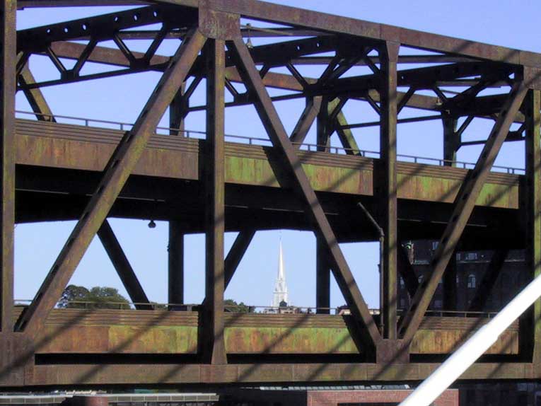 The new bridge cables cast shadows on the rusting old expressway bridge, which in turn frames the Old North Church. October 6, 2002 - More info at