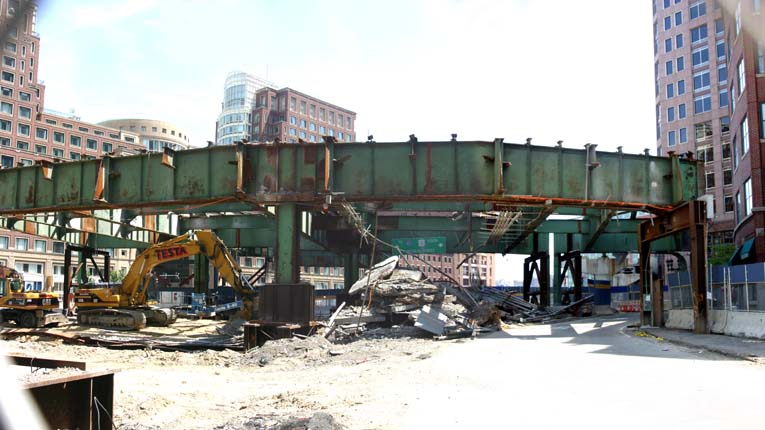 Some of the last remains of the old elevated expressway that had more onramps than actual roadway, and that bounced up and down whenever a truck passed. The "Big Dig" is nearly complete, and lies directly beneath. |